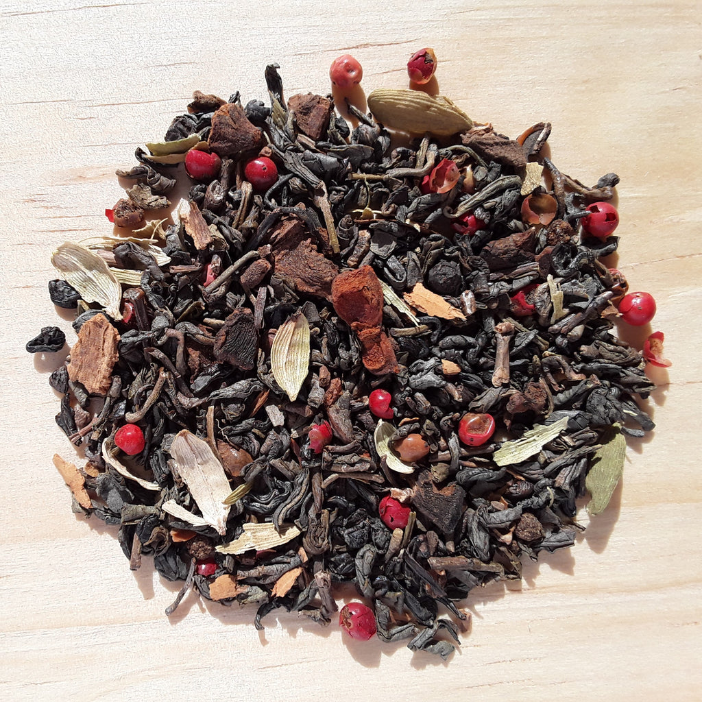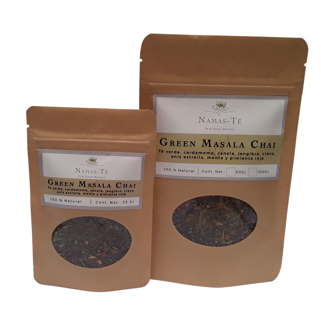 Aromático té verde Sencha japonés , con especias y hierbas aromáticas de la India (Cardamomo, pimienta roja, canela, clavo, jengibre en polvo, anís estrella y menta), popular en la medicina ayurveda por sus distintas propiedades.
