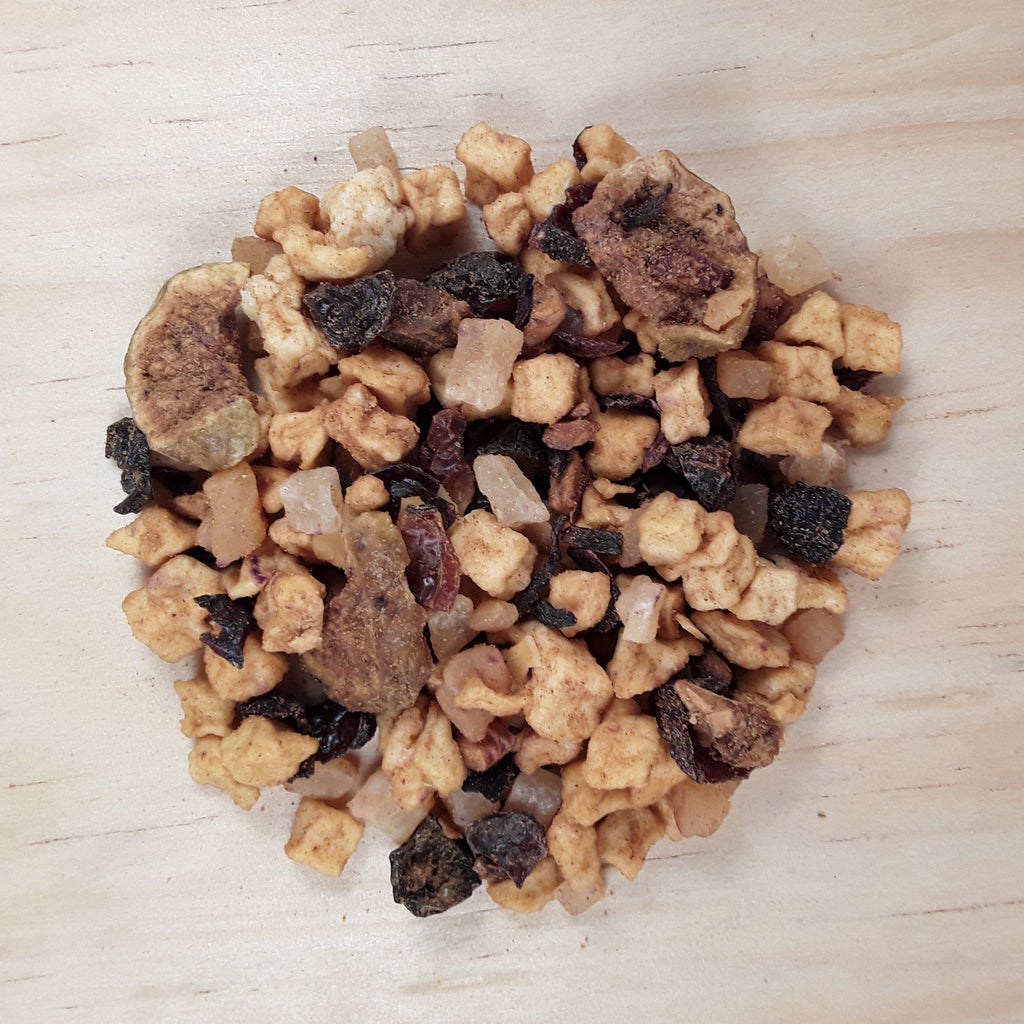 Manzana, canela, cardamomo, escaramujo, almendra, piña, melocotón, naranja, jengibre, vainilla y jamaica.