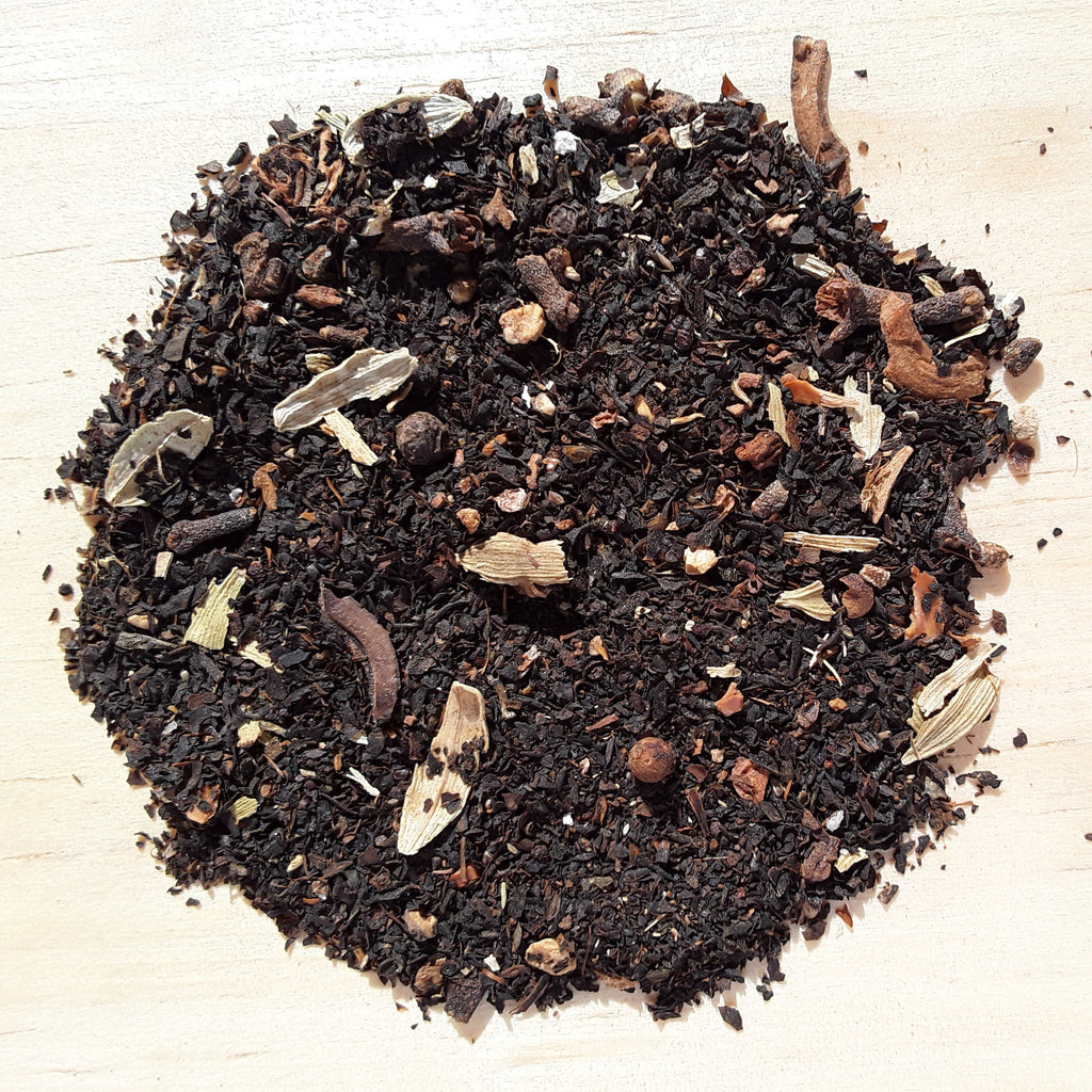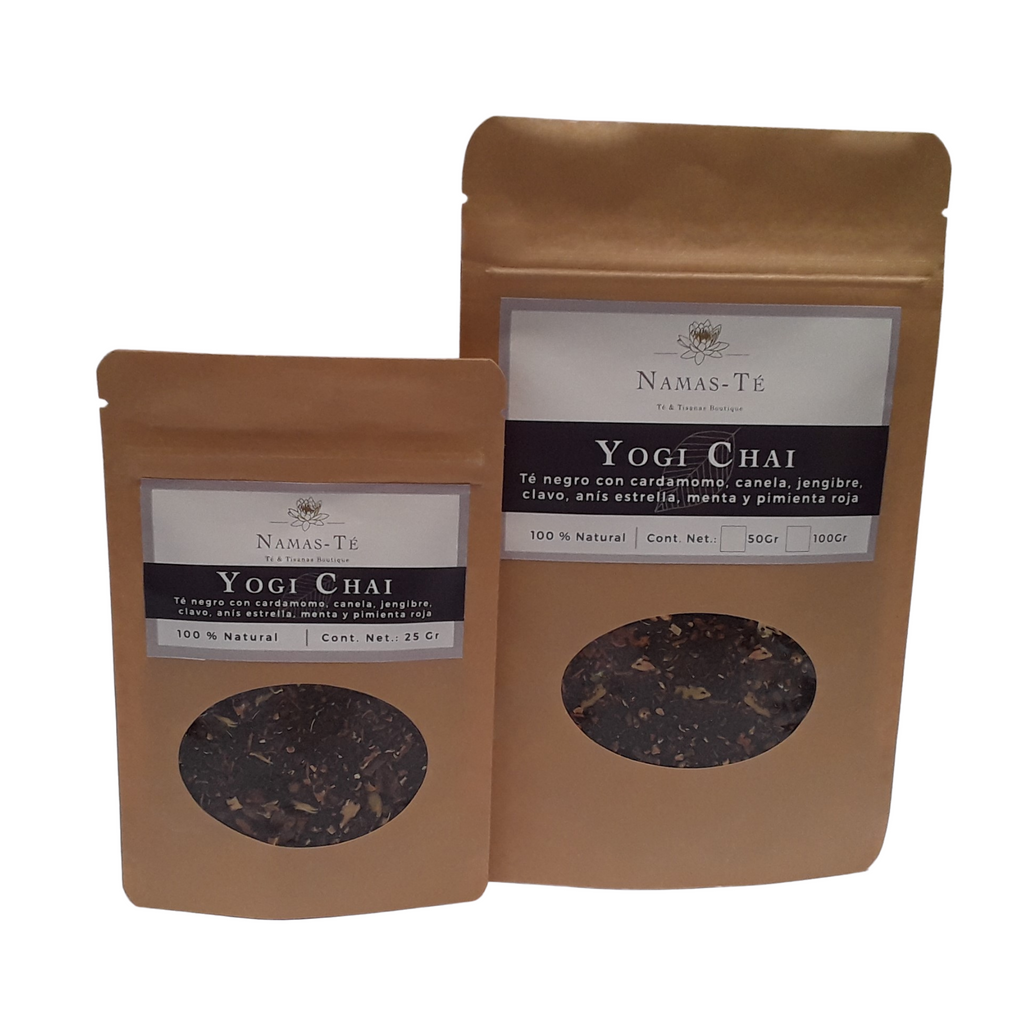 Mezcla de té negro de Assam, con especias y hierbas aromáticas de la India (cardamomo, pimienta de cayena, jengibre en polvo, canela, anís estrella y clavo) popular en la medicina ayurveda por sus distintas propiedades anti-inflamatorias y antibacteriales, el más conocido por los yogis de ahí su nombre.